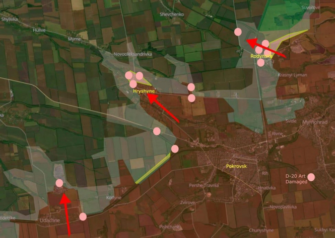 Покровськ. Три роки тому росіяни рухалися відкритою місцевістю на техніці або пішки через пересічену місцевість, щоб дістатися українських оборонних позицій. Відтоді дрони з обох боків зробили пересування відкритою місцевістю смертельно небезпечним, тому російські атаки зазвичай просуваються вздовж особливостей рельєфу, таких як дерева й будівлі. Це відображено у просуванні до Гришиного повз дерева й будівлі та у проникненнях уздовж лісосмуг.