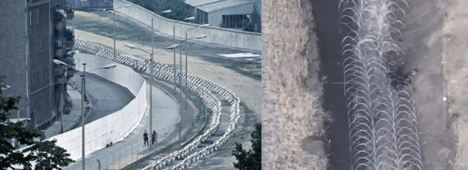 Ліворуч – східні німці створили "смугу смерті", яка не дозволяла громадянам перетинати кордон до Західного Берліна. Праворуч – українські загородження блокують техніку і сповільнюють пересування піхоти на відкритій ділянці, підвищуючи ймовірність того, що піхоту атакують і знищать. Деякі елементи цих загороджень із часом деградуватимуть, наприклад, один ряд колючого дроту, який був порушений після того, як дрон убив росіянина. Але ця деградація відбуватиметься дуже повільно, а будь-які проломи перетворюватимуться на вузьку зону ураження.
