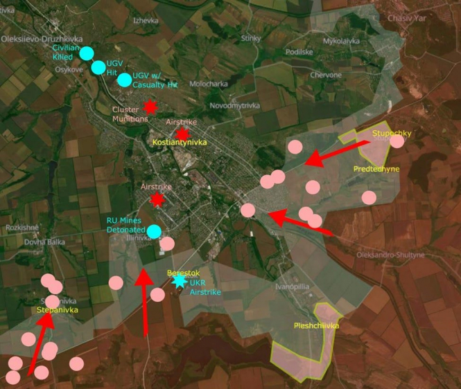 Костянтинівка. Інженери встановлюють дротяні загородження й підривають російські міни за допомогою дронів і зарядів. Ракети з касетними боєприпасами та авіаудари часто б'ють по Костянтинівці. Більшість протидронових сіток щойно на північ від міста знищено, а наземний дрон (UGV) уражено російським дроном. Це все ж краще, аніж якби було уражено вантажівку з водієм. Мирного жителя вбито, коли він їхав транспортним засобом за 800 метрів на північ від наземного дрона. Наземний дрон з пораненим уражено.