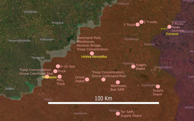 Уражені скупчення військ усі розташовувалися на головних дорогах і в селах або містечках. Там також були командні пункти для військ або дронів. Також було уражено склади дронів або постачання.