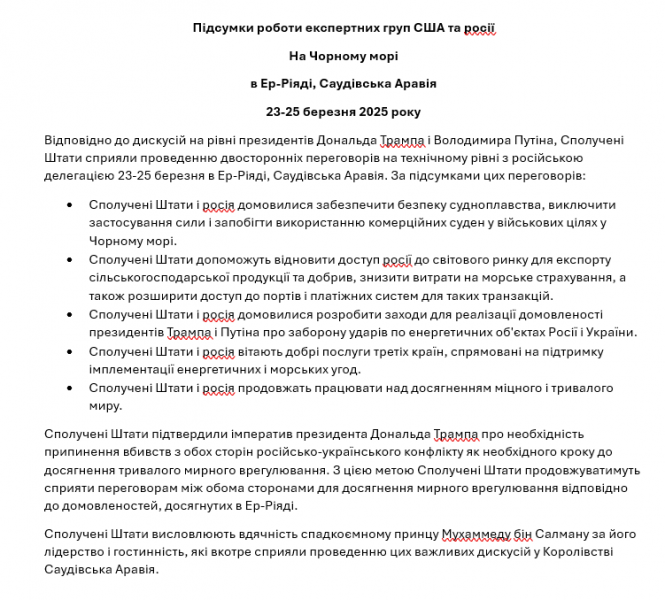 Зрештою, США та українці досягли домовленості про припинення вогню, яке, як видається, було обмеженим і не мало особливих послаблень чи переваг для України (як і для росії). Заява Білого дому про угоду США з Україною досить проста.