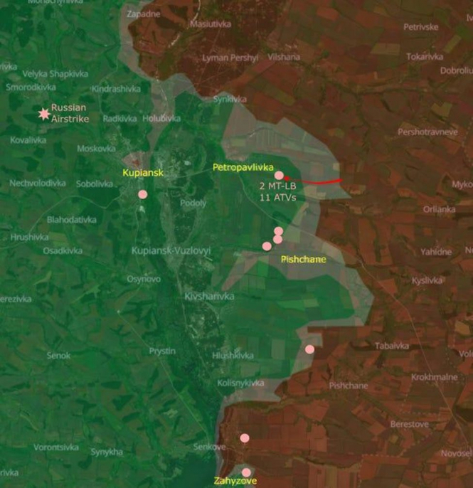 росіяни кажуть, що їхні війська в центральній районній лікарні були ліквідовані. росія завдала авіаудару на захід від Куп’янська.