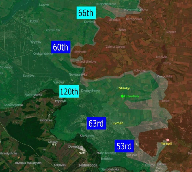Лиман. Це матеріал двотижневої давнини, але він показує місцевість навколо Ямполя. Наступна карта зображує приблизні позиції лише південної половини зони відповідальності 3-го корпусу, яка простягається на 60 кілометрів по прямій. 53-тя, 60-та та 63-тя бригади входять до 3-го корпусу. 66-та і 120-та бригади придані до корпусу.