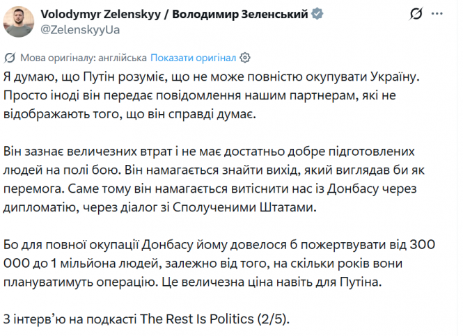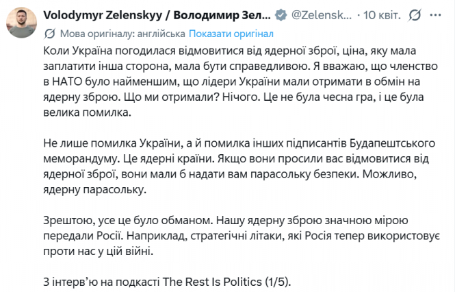 І це ще не все. Далі, у тому ж ланцюжку твітів, Зеленський заявив, що США намагаються змусити Україну відмовитися від Донбасу, водночас поставив під сумнів будь-яку значущість американських гарантій безпеки. Що отримали українці, відмовившись від ядерної зброї під тиском США свого часу? Нічого.