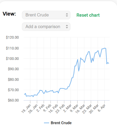 Позитивним наслідком дій Трампа для росіян стали значно кращі умови для отримання доходів від експорту нафти. Ціна на нафту не лише миттєво злетіла, а й, незважаючи на нинішнє перемир'я між США та Іраном, залишається дуже високою і, ймовірно, ще деякий час не повернеться до довоєнного рівня. Ось ціна нафти марки Brent за останні 3 місяці, щоб ви могли скласти уявлення. Навіть з урахуванням нещодавнього падіння ціни зросли приблизно на 50%.