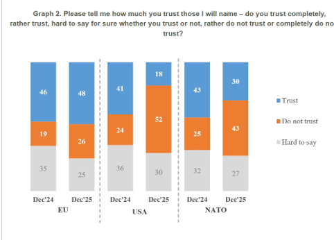 У дослідженні Київського міжнародного інституту соціології, опублікованому на початку 2026 року, але заснованому на даних кінця 2025 року, дуже добре видно, як довіра до США обвалилася протягом 2025 року, тоді як довіра до Європи залишилася на тому самому рівні або навіть зросла.