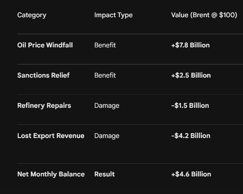 Ця українська кампанія дещо зменшила російські надприбутки, але не поклала їм край. росія й досі експортує, хоча й у менших обсягах. Якщо зважити економічні переваги для росії (значно вищі ціни та легший збут) та недоліки (зменшення експортних потужностей і витрати на ремонт), то ось який песимістичний розрахунок я зробив щодо щомісячних доходів росії.