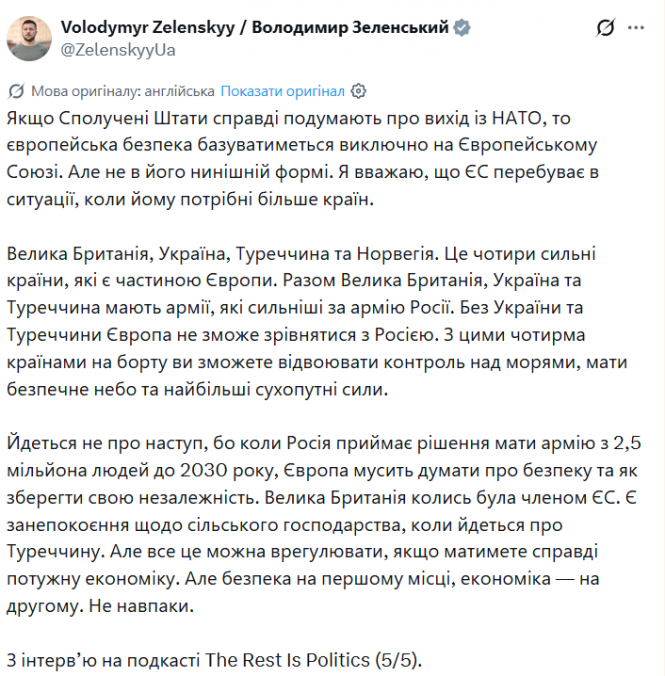 Невдовзі після публікації Зеленський пішов ще далі. У своєму твіті, адресованому безпосередньо європейським політикам, Зеленський заявив, що Європі слід планувати власну оборону, спираючись виключно на європейські ресурси, без участі США. Щоб підготуватися до такого світу, Зеленський закликав до досить радикальних заходів – створення нових та розширення наявних структур. Цікаво, що він закликав включити Туреччину до нової, оновленої європейської структури безпеки (яка, схоже, має бути своєрідним більш унітарним Європейським Союзом). Варто уважно прочитати всю заяву.