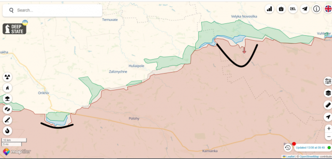 Тим часом українці випробовують свою стратегію пресингу в низці місць по всій лінії фронту, досягаючи невеликих успіхів (хоча вони стають стабільними) і водночас виснажуючи російські сили. На Запорізькому фронті вони, схоже, зосереджуються на розширенні двох виступів: один спрямований на Роботине на заході, а інший зараз рухається на південь від Старомайорського на сході. Я поставив навколо них жирні лінії.