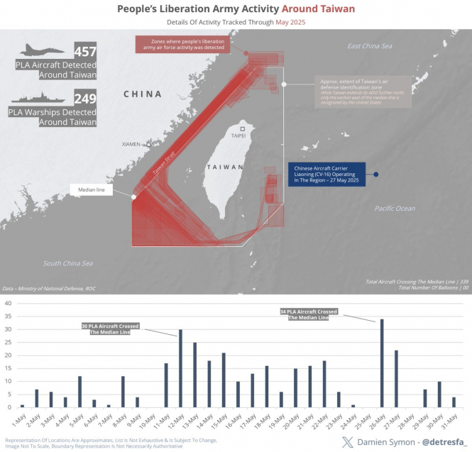 Щомісячні операції Китаю навколо Тайваню. Нещодавно Даміан Симон опублікував щомісячний звіт про діяльність НВАК навколо Тайваню.