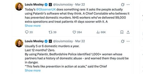Мослі – це онук Освальда Мослі, який заснував Британський союз фашистів, відомий як "чорносорочечники". Приклади, на які він посилається, були кейсами, які політична редакторка The Observer отримала ексклюзивно. Мослі також дав їй ексклюзивне інтерв'ю. Для порівняння: перед нашим першим розслідуванням Palantir не відповів на жоден із запитів преси, які ми йому надсилали. Матеріал The Observer захований за платним доступом – як і вся його журналістика тепер, але текстова версія є тут.