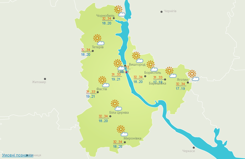 У центральних та східних областях температура вдень буде від +31 до +35 градусів, а вночі від +16 до +21.