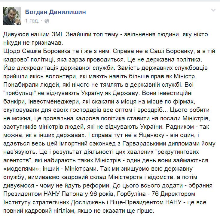 "Справа не в Саші Боровику, а в тій кадрової політиці, яка зараз проводиться. Це не державна політика", - пише Данилишин на своїй сторінці в Facebook.
