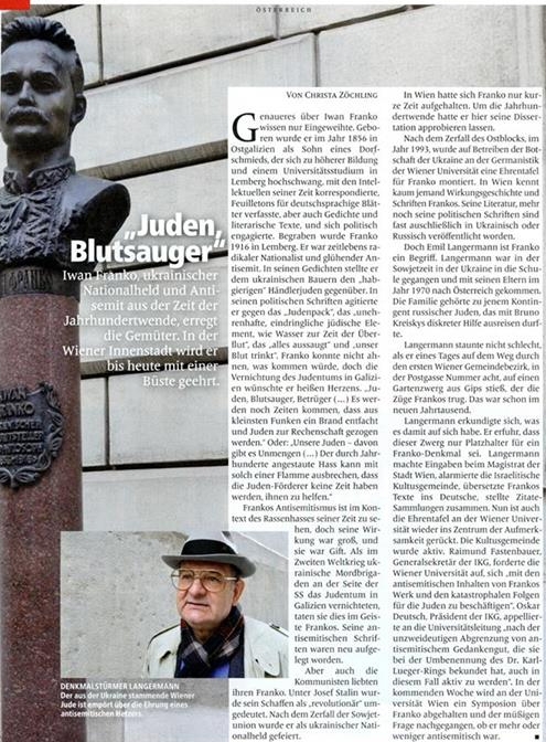 У публікації також ставлять під сумнів доцільність подальшого збереження пам`ятника "антисеміту" Франку, який встановили у центрі Відня.