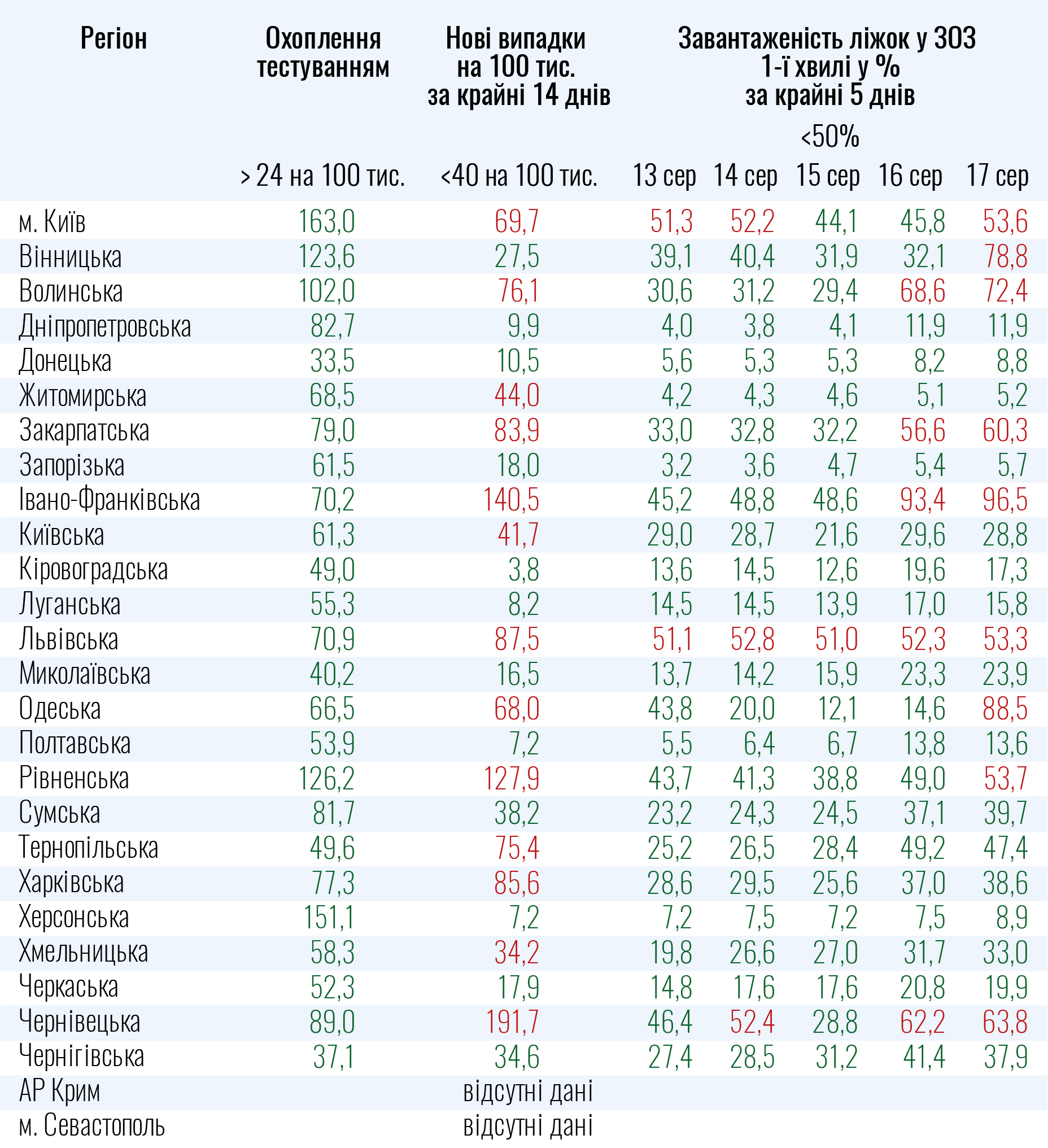 Показник нових випадків коронавірусу перевищено в усіх вищезазначених регіонах, крім Вінницької, яка не відповідає критерію заповнювання ліжок. У той же час у Львівській області цей критерій перевищено всі останні п'ять днів.