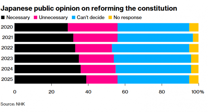 Як зауважує видання, Ліберально-демократична партія Такаїчі також отримала дві третини місць у парламенті, що дає їй можливість ініціювати конституційні зміни. Вона давно виступає за реформу пацифістської конституції, яка була нав'язана США після Другої світової війни і відтоді не змінювалася.