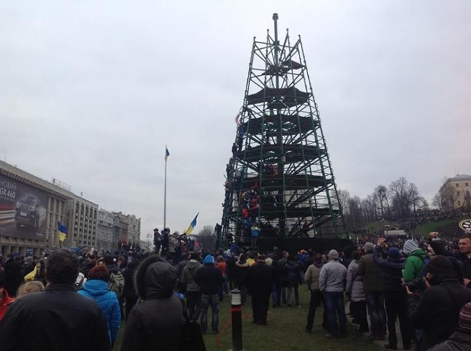 Частина народу деякий била в металеві щити, встановлені біля підніжжя конструкції новорічної ялинки, яка монтується на Майдані Незалежності.