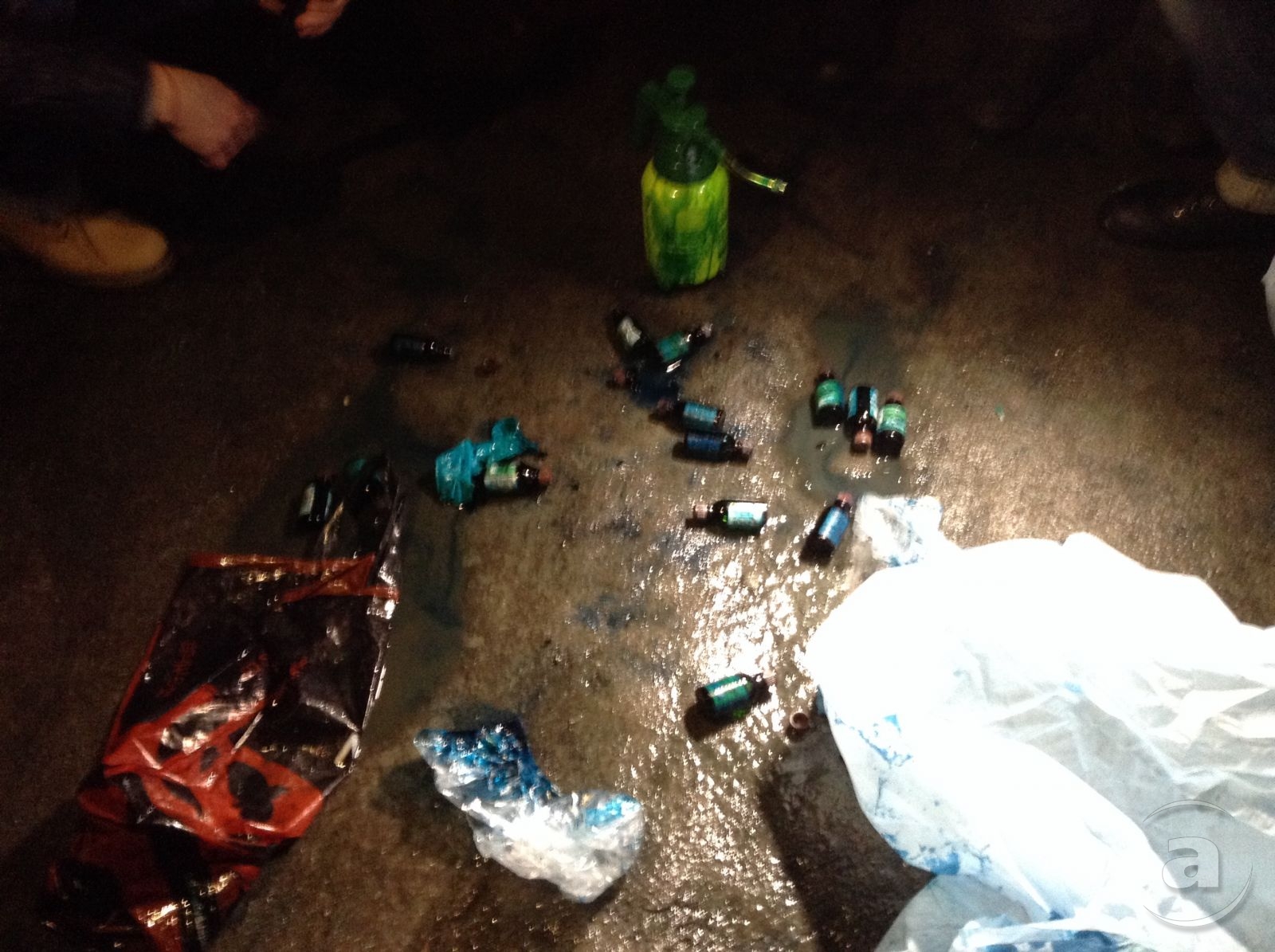 Одному із зловмисників вдалося втекти, при цьому він викинув пакет, в якому знаходилося близько 15 бульбашок зеленки і пластикова пляшка з пульверизатором. Ще одного нападника затримала міліція.