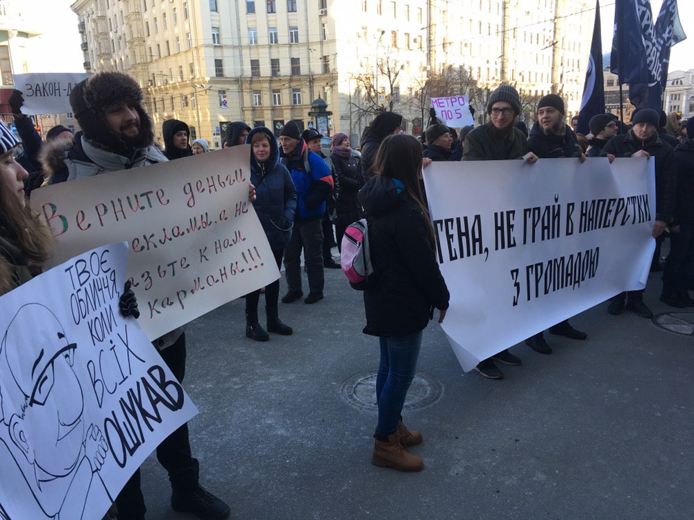 Учасники "Маршу злих харків'ян" тримали в руках плакати "Метро по 5", "Гена, не грай в наперстки з громадою", "Поверніть гроші від реклами, а не лізьте до нас у кишені".