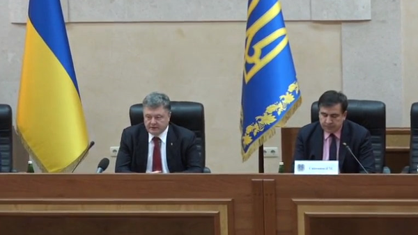 "І це ті завдання, які я ставлю новопризначеному голові Одеської обласної державної адміністрації; великому другу України; людині, яку я знаю більше 25 років, ще з університету; людині, яка не словом, а ділом довела, що може не тільки демонструвати хороші знання і народжувати креативні пропозиції, а й впроваджувати їх у життя, яка змінила всю країну. Ім'я цієї людини - Михайло Саакашвілі ", - сказав Порошенко.