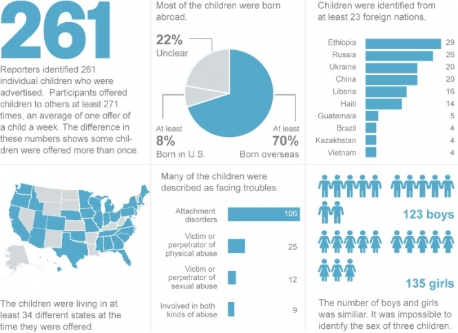 Reuters з’ясував, що батьки "рекламують" прийомних дітей у групах у Facebook та на форумах Yahoo! Їх віддають незнайомцям здебільшого без відома державних органів опіки.