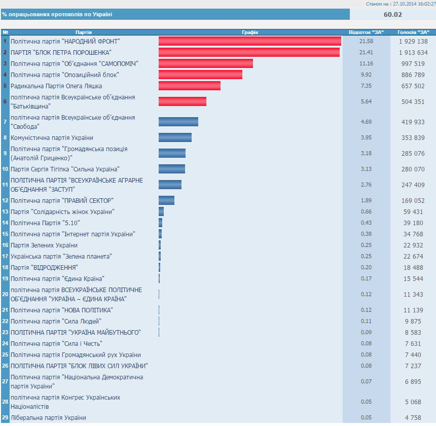 Згідно з ними, на позачергових виборах до Верховної Ради України партія "Народний фронт" Арсенія Яценюка набирає 21,58%, партія "Блок Петра Порошенка" - 21,41%, партія "Самопоміч" - 11,16%, партія "Опозиційний блок" - 9,92%, Радикальна партія Олега Ляшка - 7,35%, партія "Батьківщина" - 5,64%.