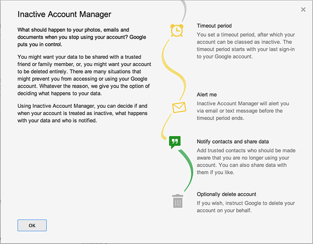 За допомогою Inactive Account Manager на сторінці налаштувань користувач сам може вибрати дату його активації - через 3, 6, 9 або 12 місяців. Також можна запрограмувати "віртуального виконавця заповітів", що він повинен вчинити з вашими "майном" - знищити або відправити довіреним особам.