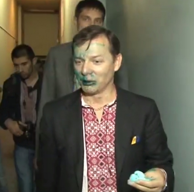 "А що ви тут робите?", - запитав Ляшко. У відповідь він нічого не почув, однак вже буквально перед самим входом до будівлі молодики підбігли і облили Ляшка зеленкою. Потім швидко побігли у натовп.
