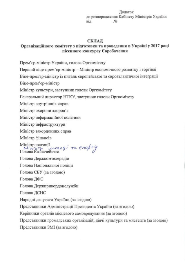 "Утворити Організаційний комітет з підготовки та проведення в Україні у 2017 році пісенного конкурсу Євробачення у складі згідно з додатком", - йдеться в розпорядженні Кабінету міністрів.