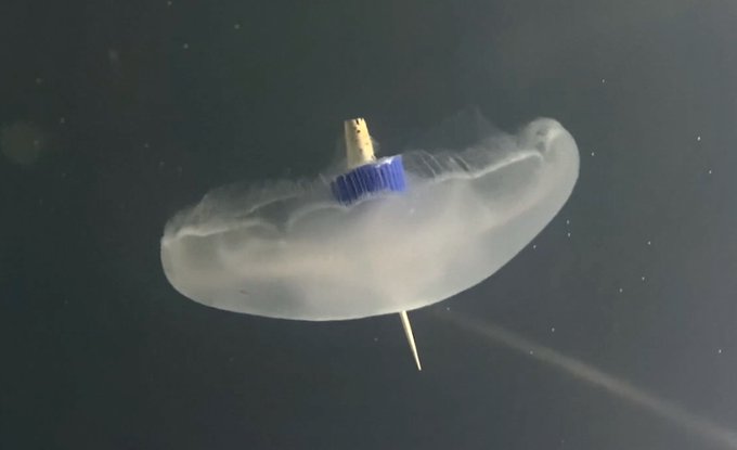 Зазначається, що вчені розробили "мікроелектронний протез", який кріпиться до нижньої частини вухатої медузи (аурелії). З боків тварини кріплять два електроди, з'єднані з протезом.