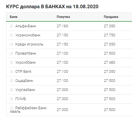 Курс долара на міжбанку за станом на 10:30 18 серпня 2020 року в продажу в порівнянні із закриттям попередньої сесії знизився на 1 копійку до 27,25 гривень за долар, курс купівлі до 27,22 гривень за долар. Курс євро на продажу зріс на 2 копійки до 32,38 гривень за євро.
