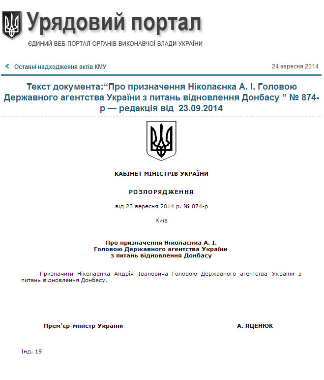 Відповідне розпорядження 23 вересня 2014 року № 874-р з’явилось на сайті Кабінету міністрів.