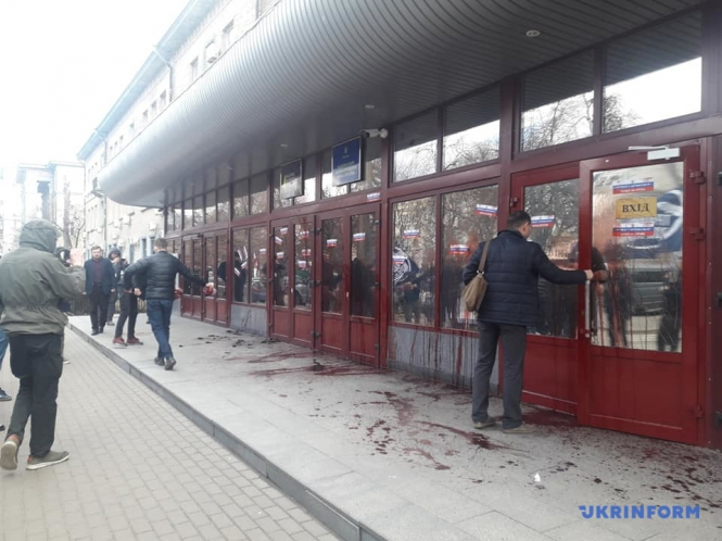 Також мітингувальники облили вхід до НАБУ бичачою кров'ю та закидали яйцями.