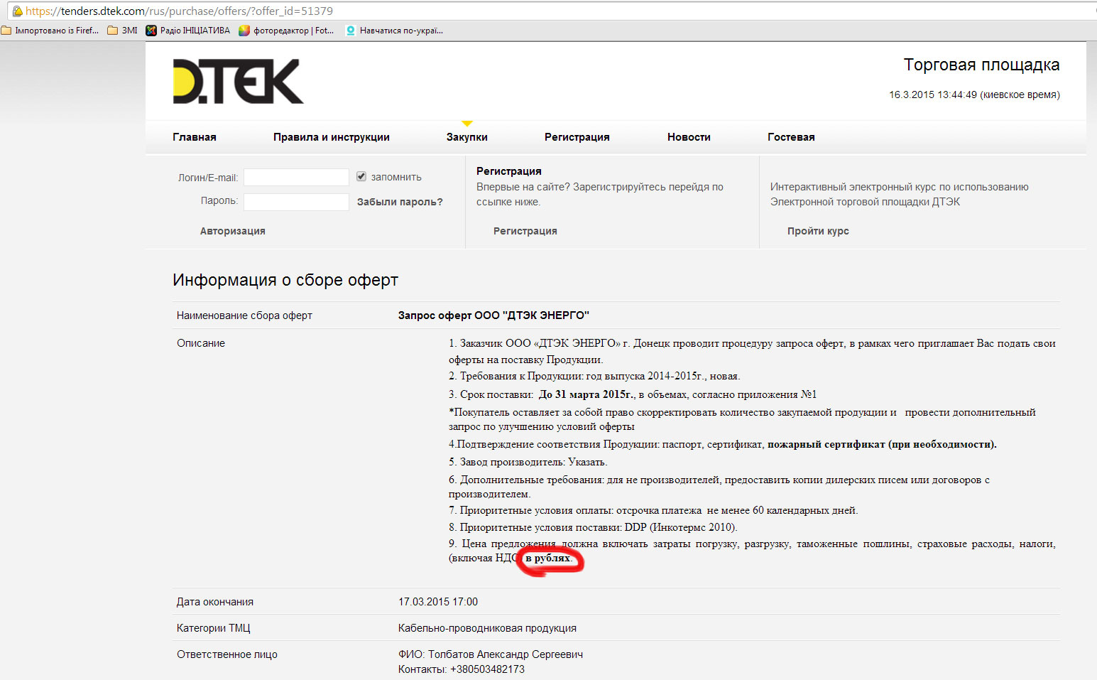 Заказчик ООО "ДТЭК ЭНЕРГО" г. Донецк проводит процедуру запроса оферт, в рамках чего приглашает Вас подать свои оферты на поставку Продукции. Срок поставки: До 31 марта 2015г. Речь идет о закупке кабельной продукции.