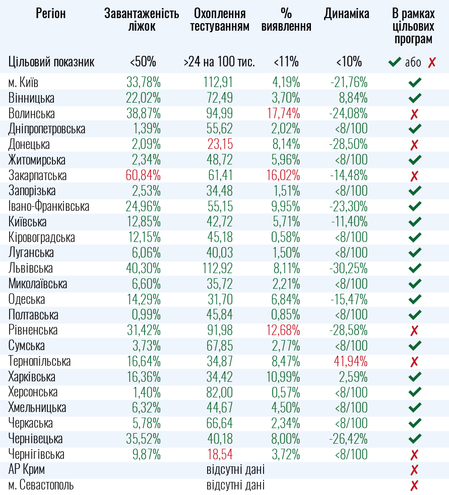 в частности, в Донецкой и Черниговской областях проводится недостаточное количество тестирований на коронавирус; в Тернопольской области превышен показатель динамики; проценту обнаружения не соответствуют Волынская, Закарпатская и Ровенская области. При выходе на Закарпатье также заполнены более 50% коек в больницах.
