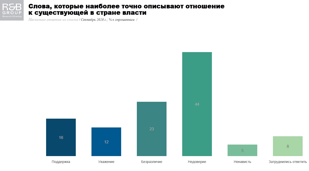 По данным опроса, недоверие к власти выражают 44% респондентов, равнодушие - 23%, ненависть - 5%. Заявили о поддержке власти 16% опрошенных, а 12% испытывают уважение.