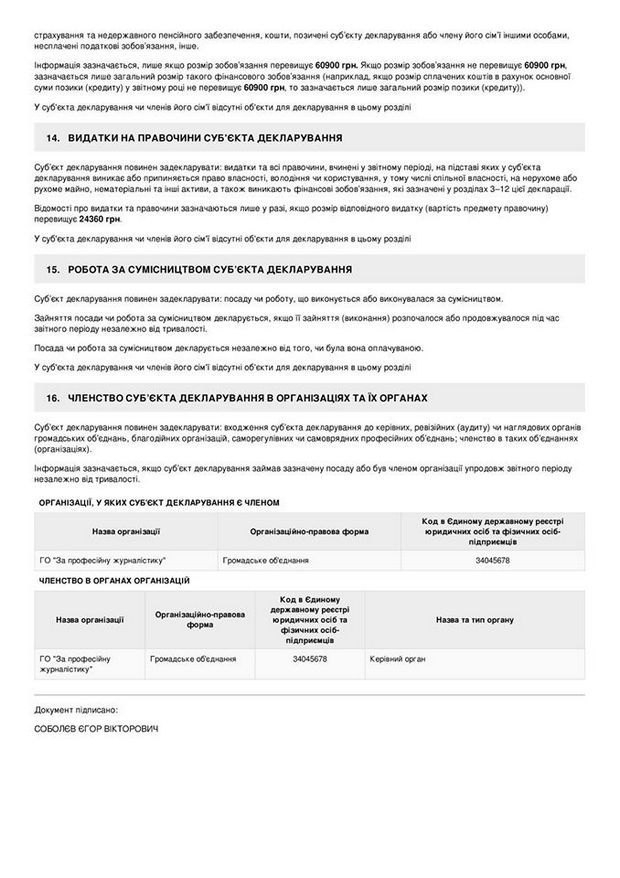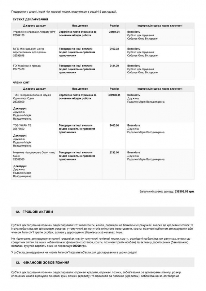 Согласно декларации, Соболев в 2015 году получил 78,2 тыс грн зарплаты, а также 2460 гривен гонорара от "Международного центра перспективных исследований" и 2124 гривны от "Украинской правды".