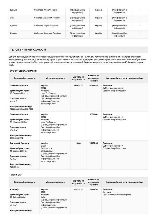 Депутат Соболев владеет двумя земельными участками площадью 800 кв м и 136,9 кв м в селе Горобовичи, а также дом на 54,2 кв м в Белоцерковцах. У его жены Марии Падалко во владении есть квартира в Киеве площадью 47 кв м.