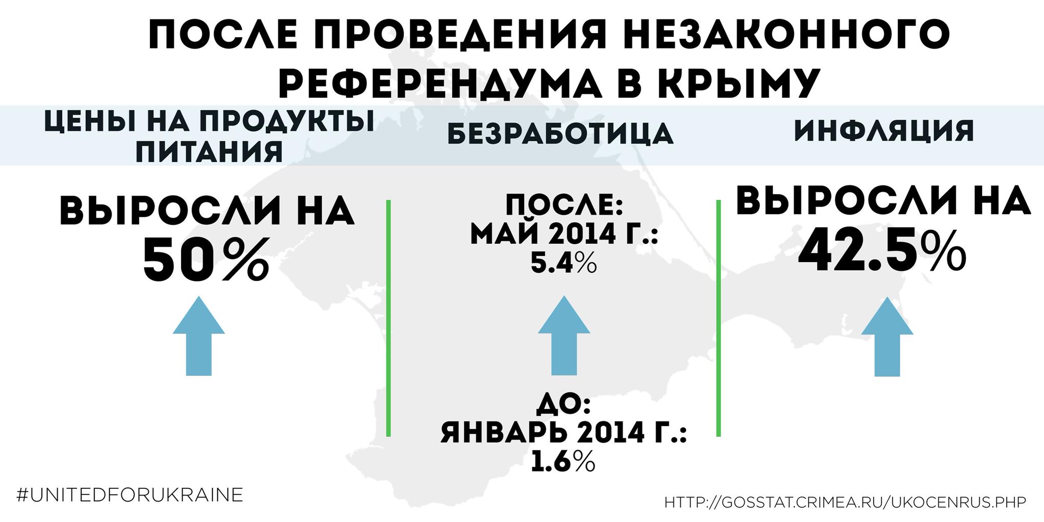 По данным инфографики, цены на продукты питания выросли на 50%, уровень безработицы составляет 5,4%, инфляция составила 42,5% - такой результат присутствия России в Крыму за последний год.